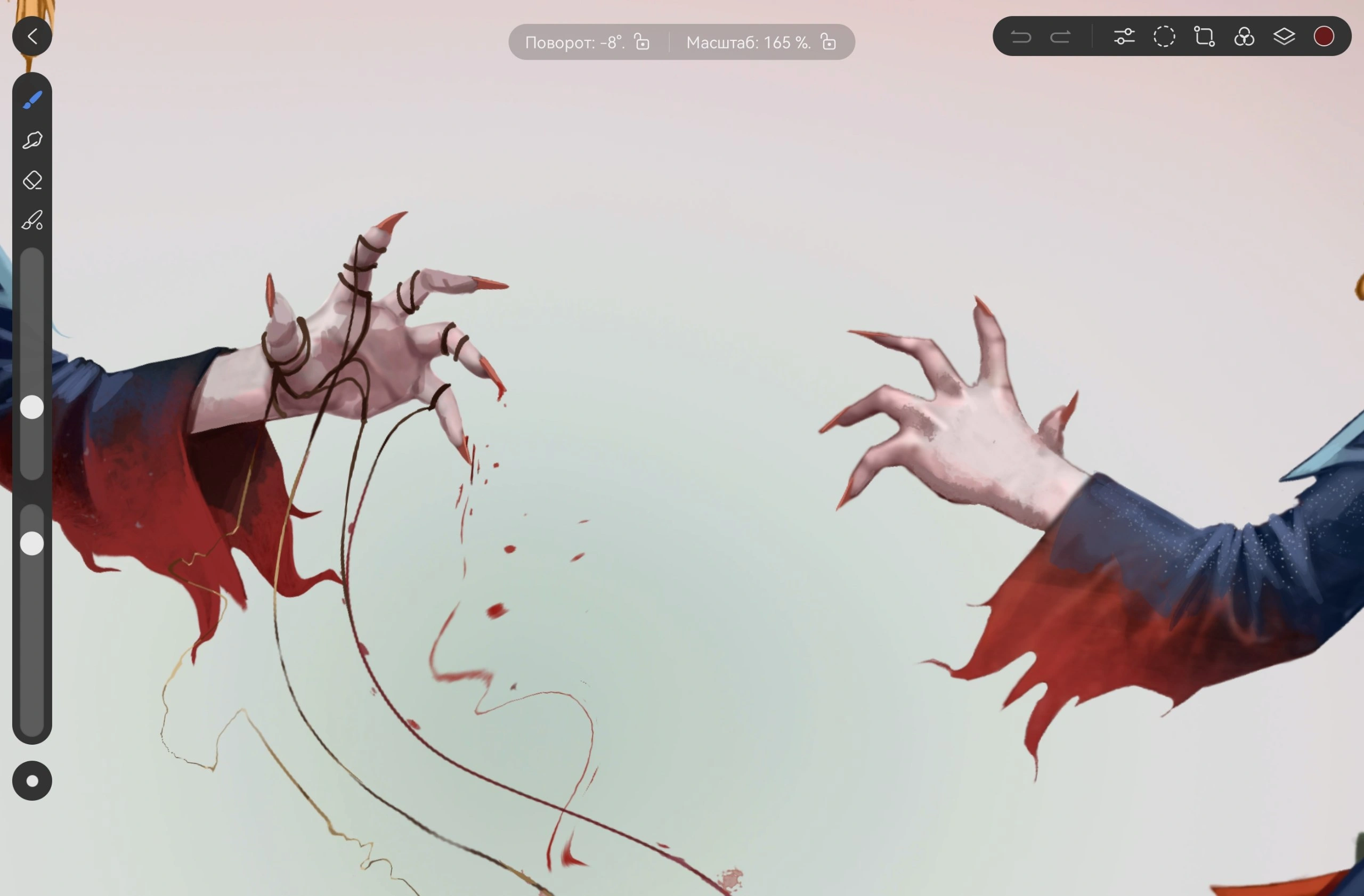 Пластика рукДлинные сухие пальцы и острые когти. Нити, уходящие к маске, и напряженный жест.