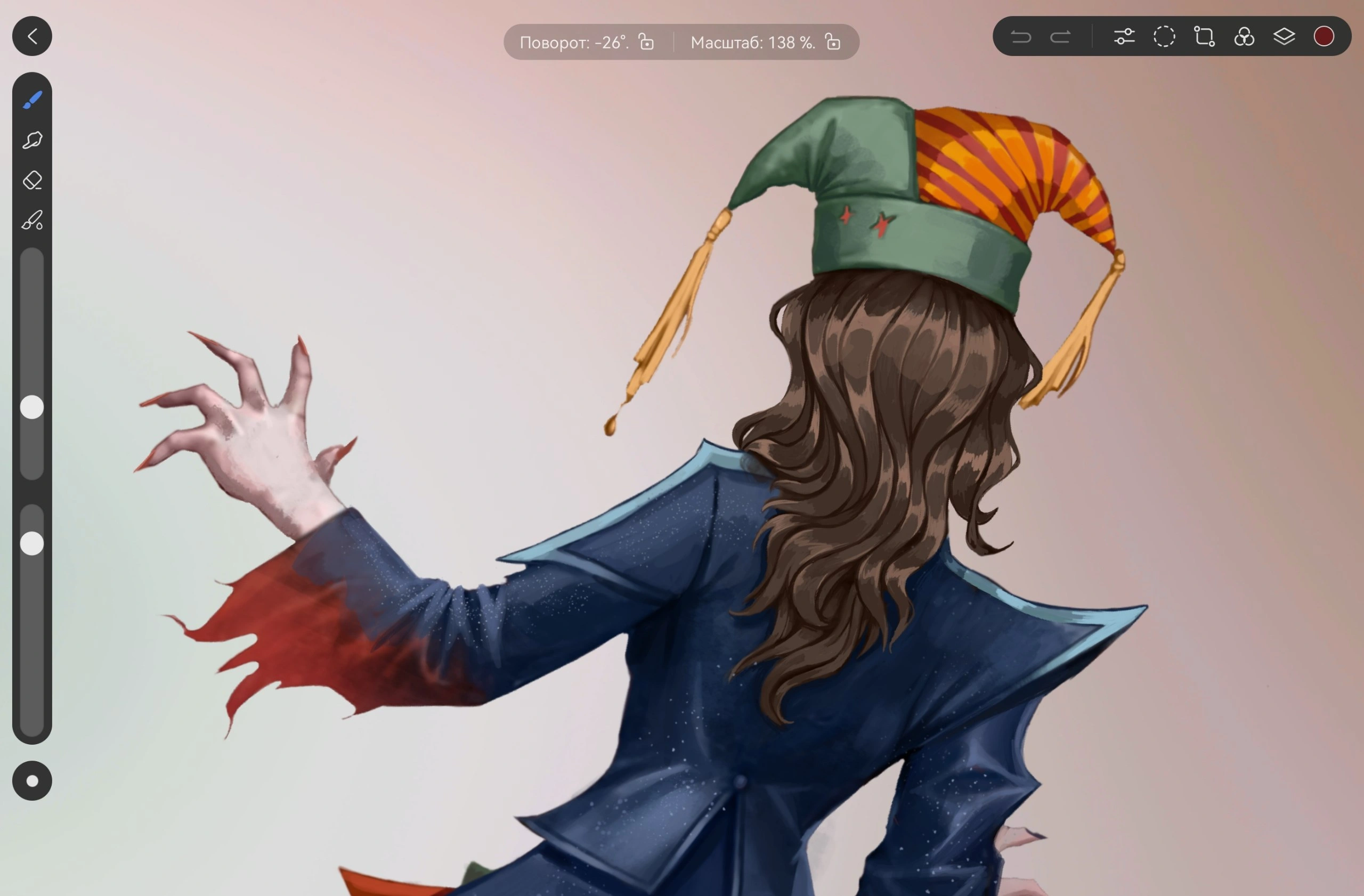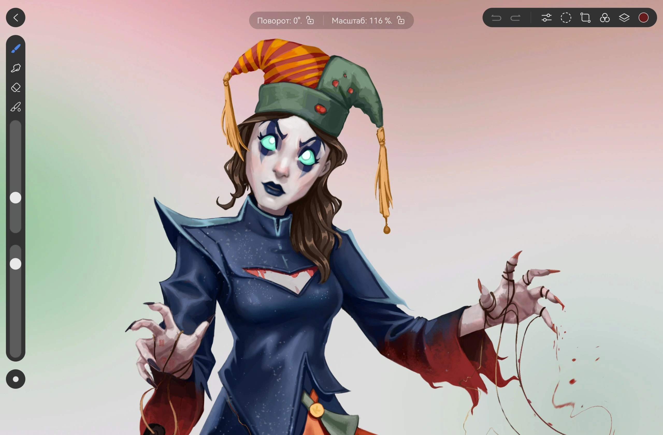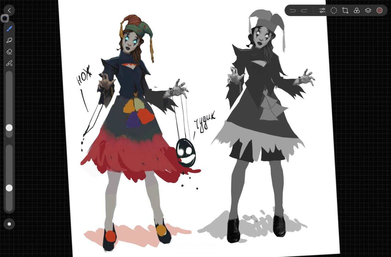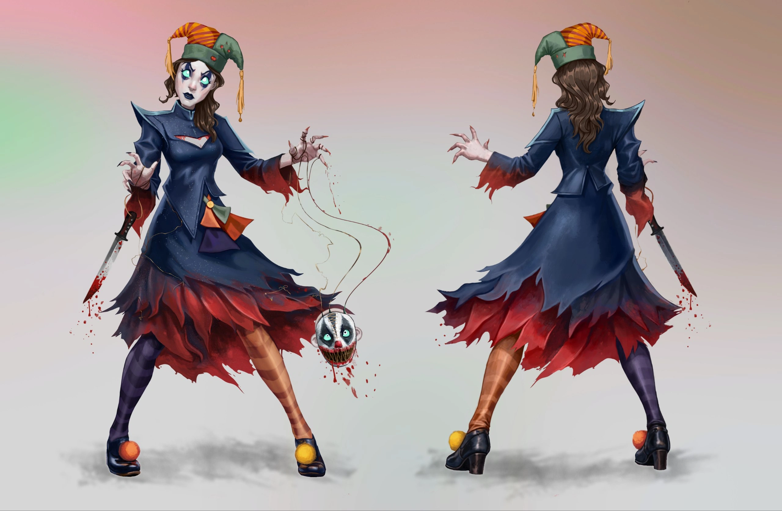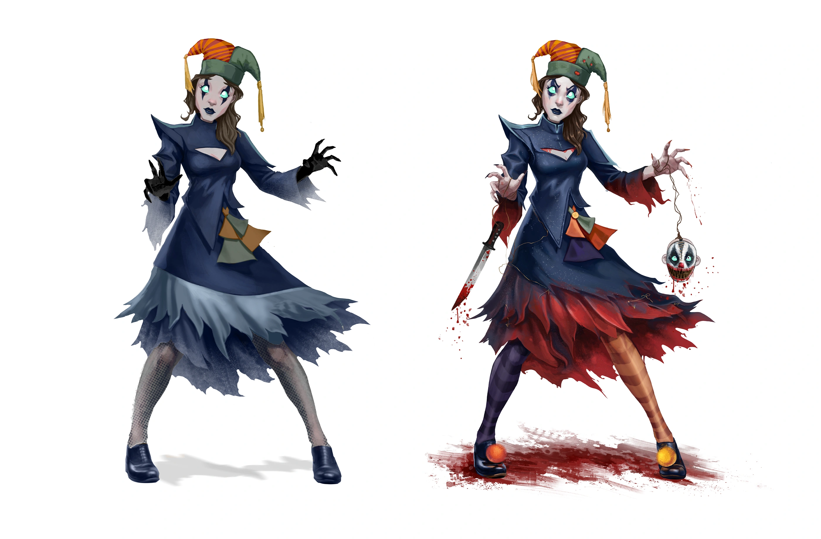 Лицо и эмоцииМертвенно-бледная кожа и бирюзовое свечение глаз. Проработка фактуры ткани на шутовском колпаке.