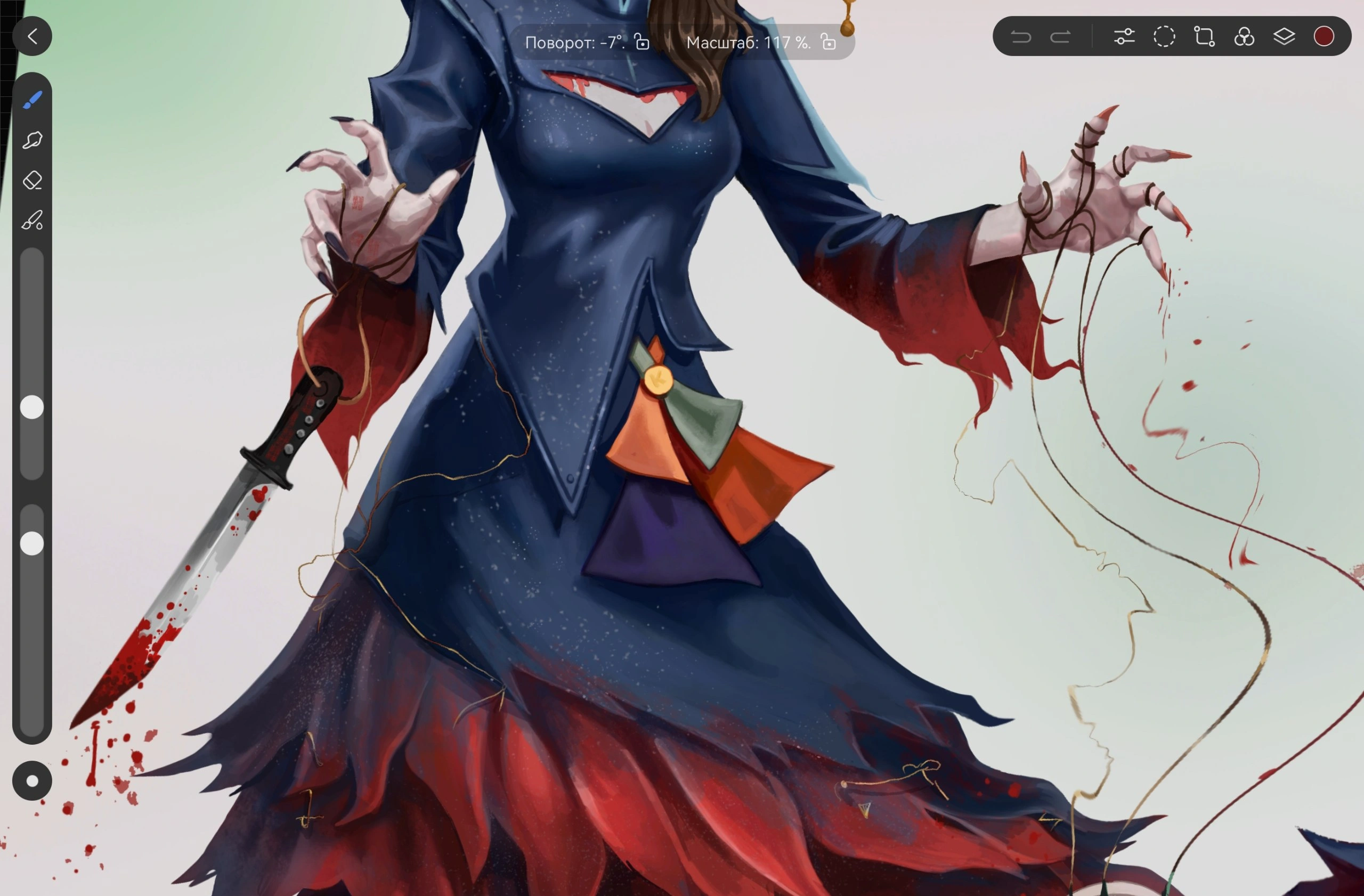 Торс и деталиАкцент на острых плечах, блики на атласе и тонкие нити в пальцах. Реалистичные потеки крови на лезвии.